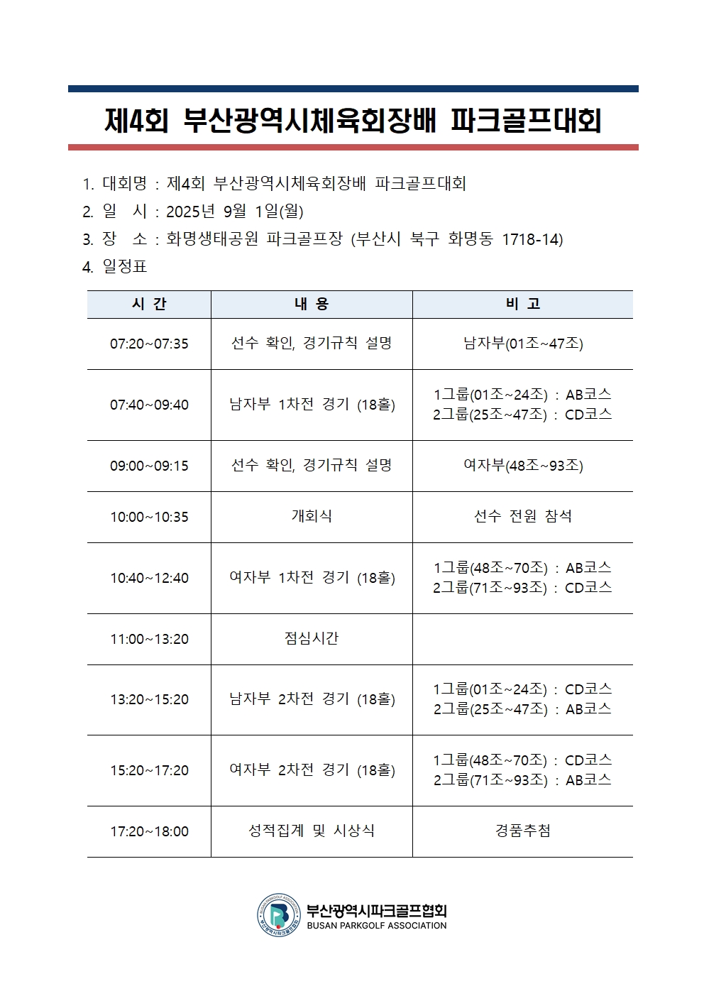 부산광역시체육회장배 파크골프대회 일정 변경 (9/1)
