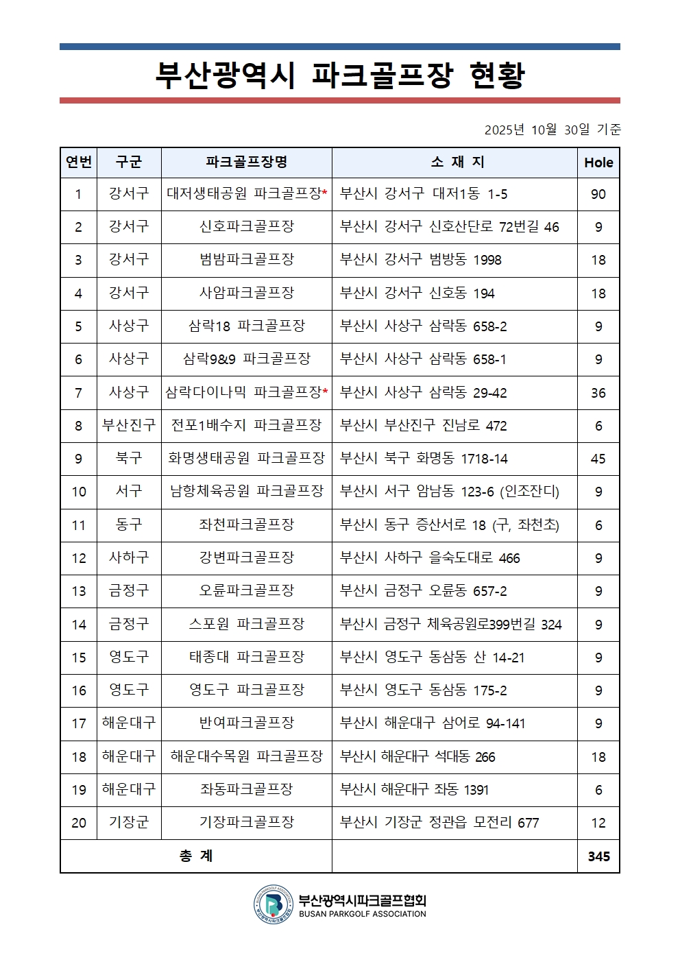부산광역시 파크골프장 현황 (2025.10.30 기준)