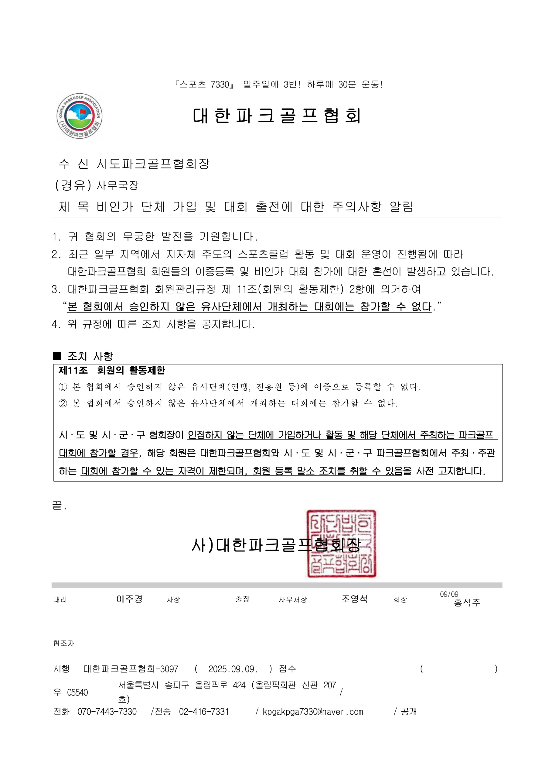 [대한파크골프협회] 비인가 단체 가입 및 대회 출전에 대한 주의사항 알림