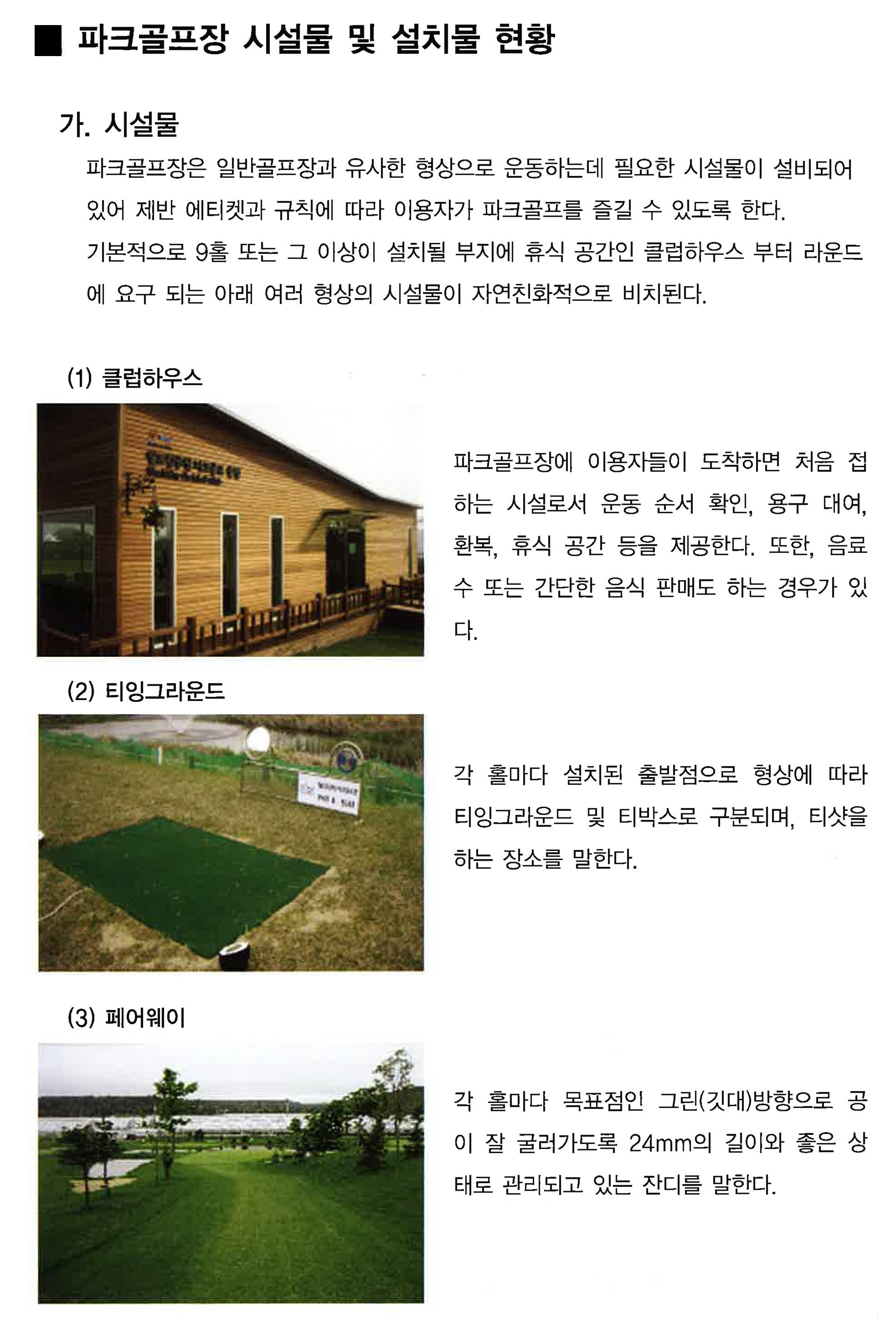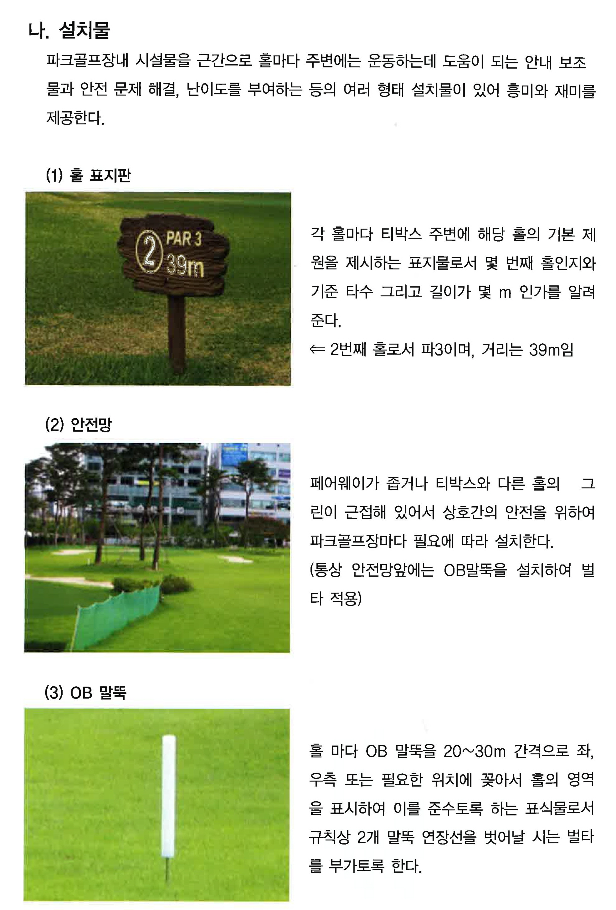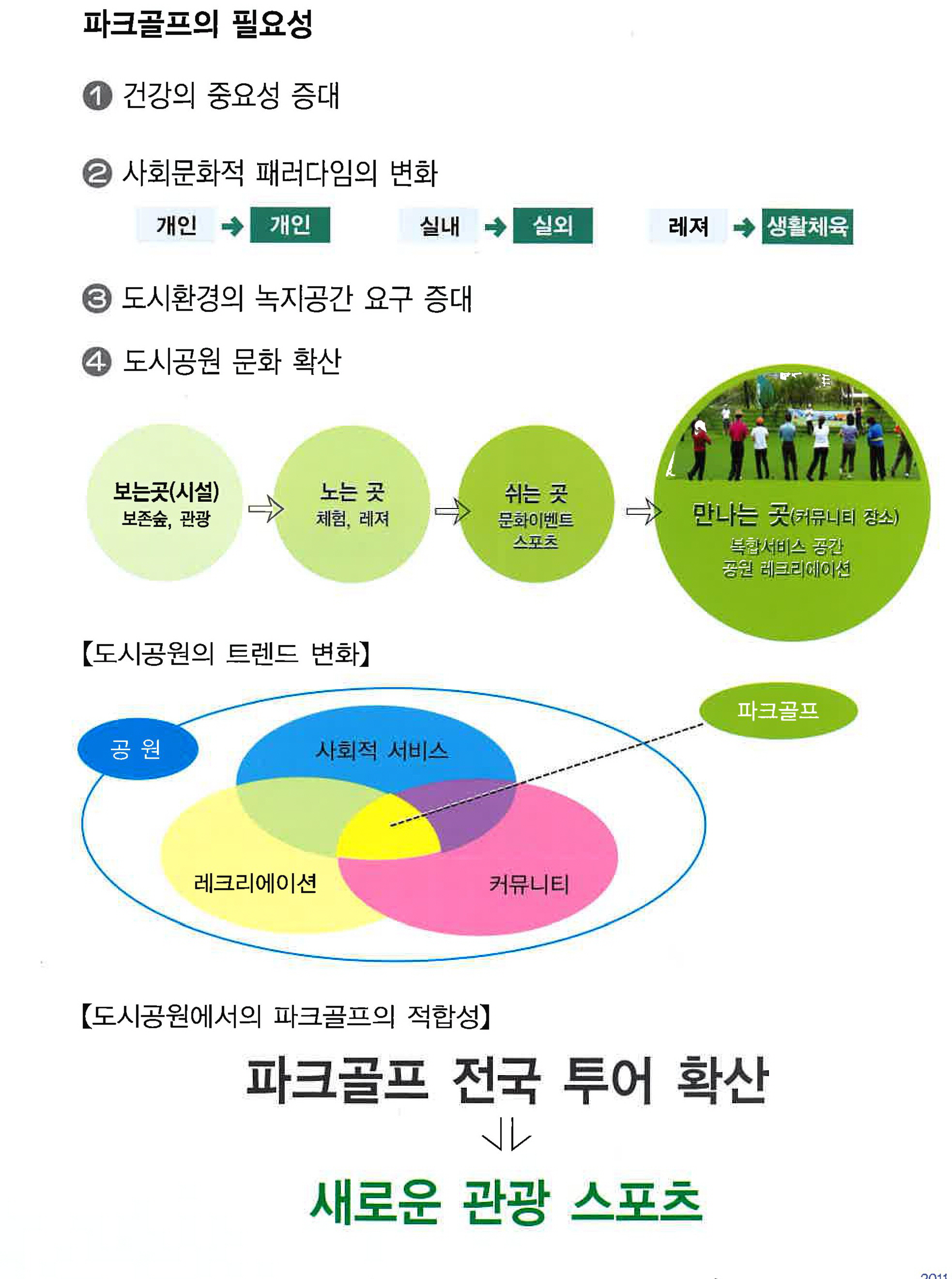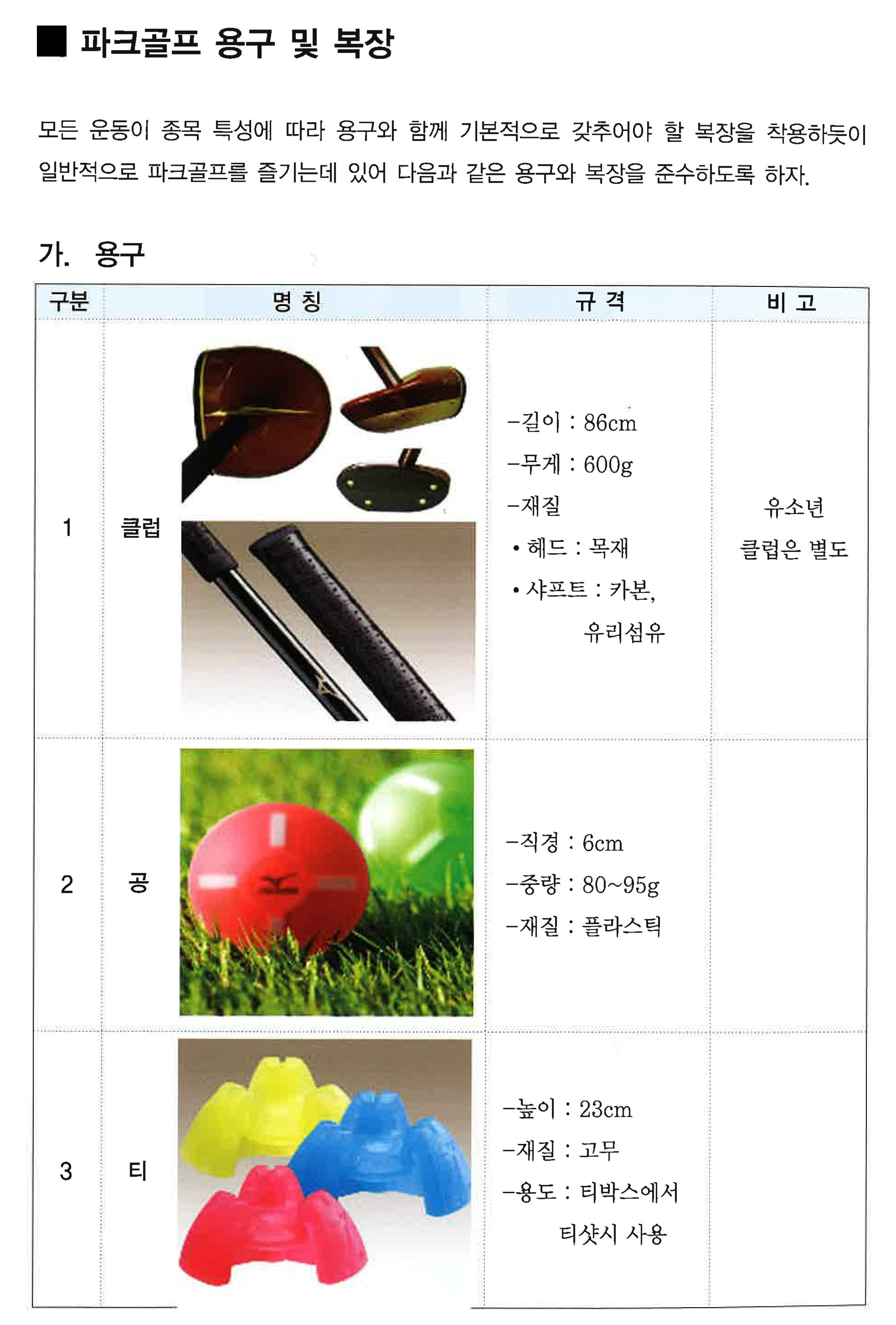 - 파크골프는 일반골프룰보다 재미있게 즐길 수 있도록 재편성한 스포츠로서 도심의 공원또는 유휴부지에 조성하여 남녀노소장애인 모두가 함께 즐길 수 있는 특징을 가지고 있다.