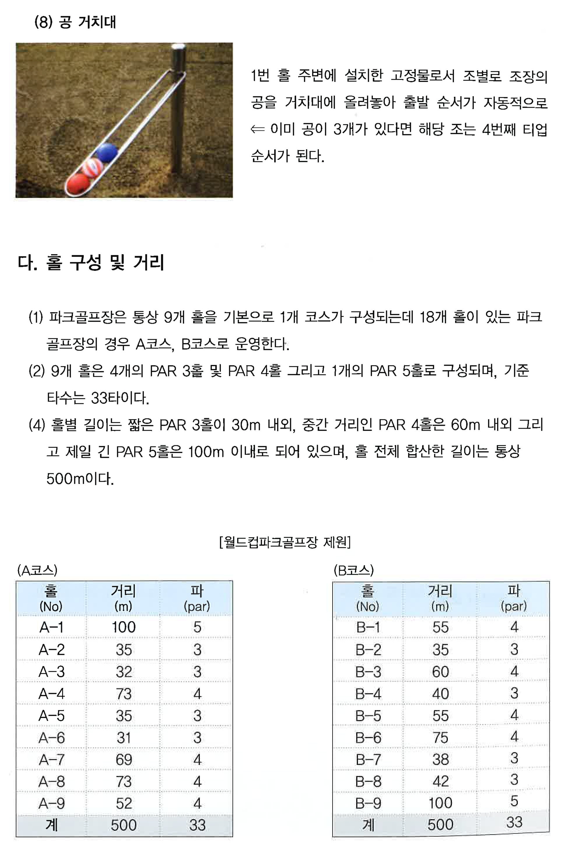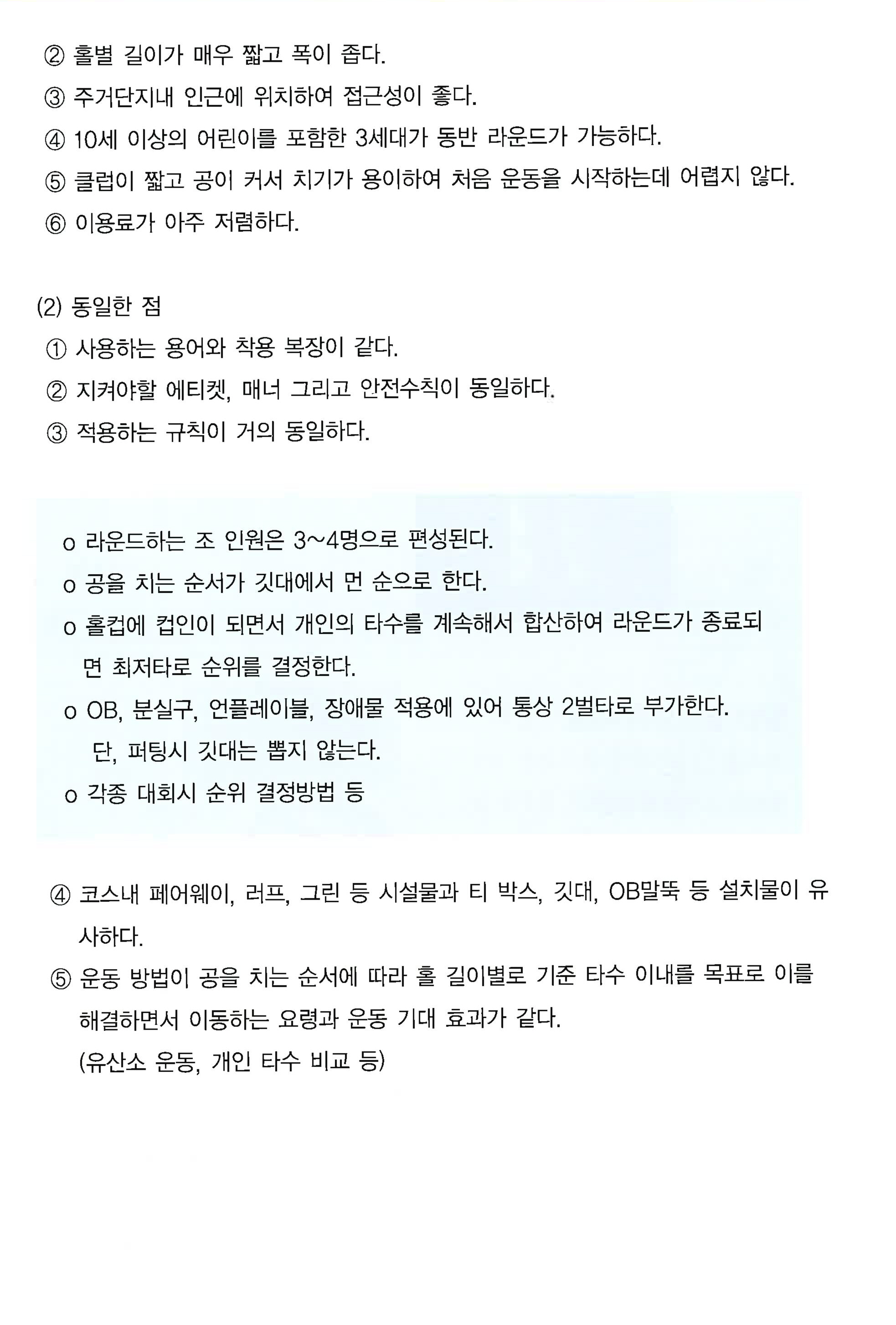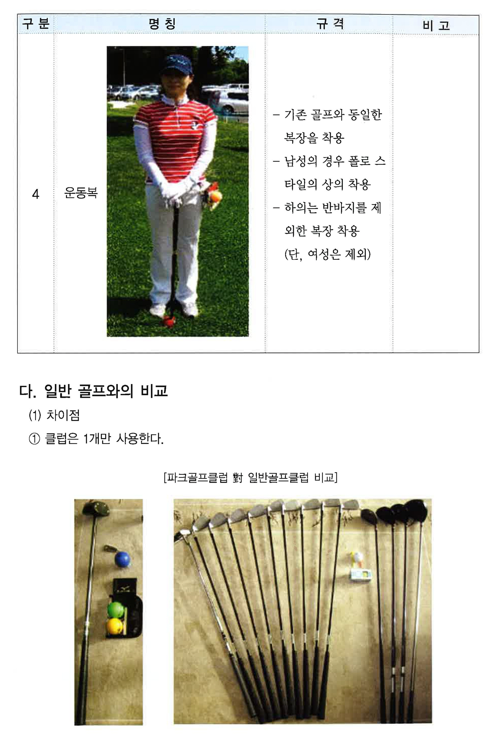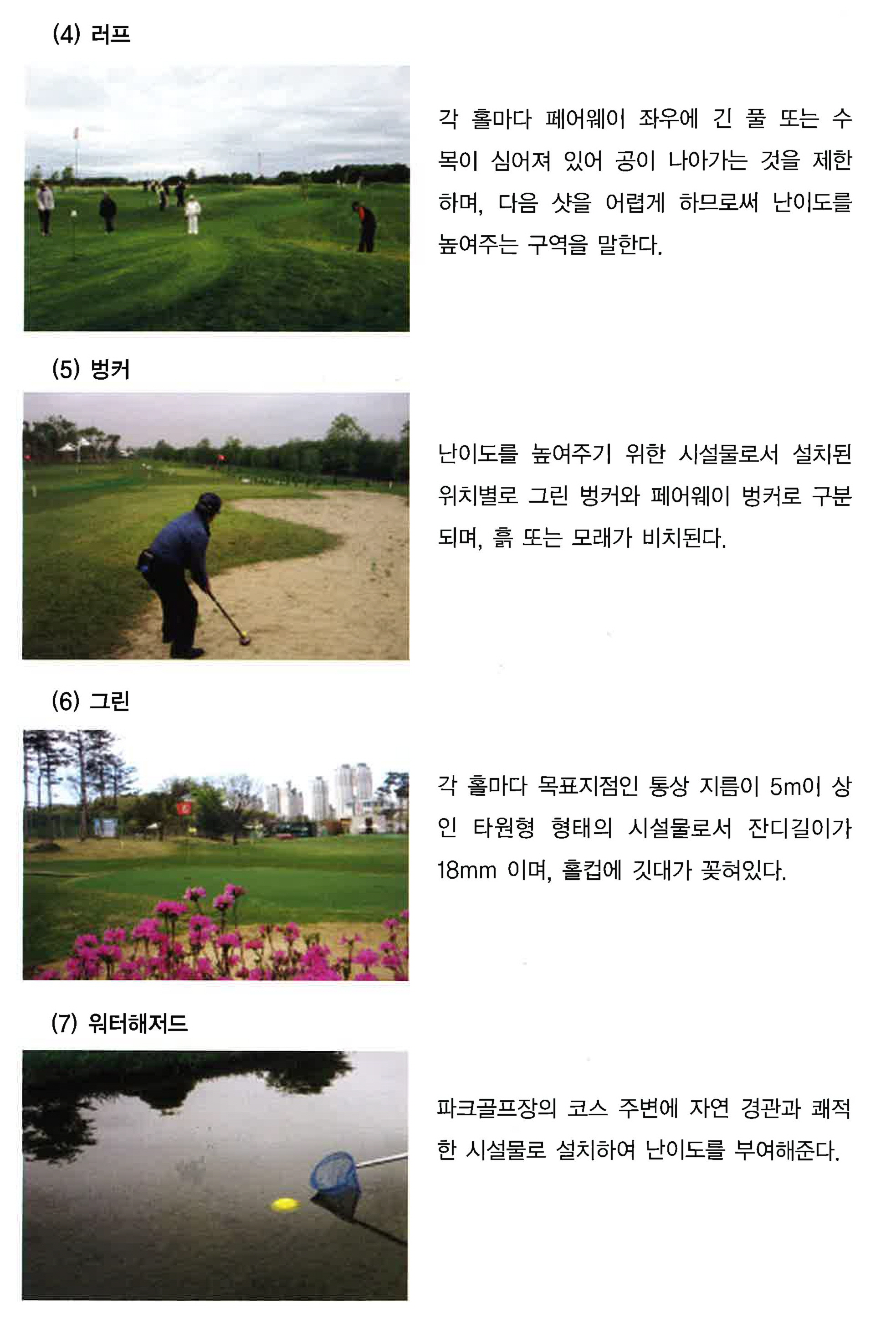 - 파크골프는 일반골프룰보다 재미있게 즐길 수 있도록 재편성한 스포츠로서 도심의 공원또는 유휴부지에 조성하여 남녀노소장애인 모두가 함께 즐길 수 있는 특징을 가지고 있다.